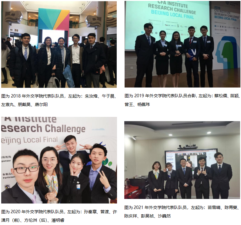 在高手如云、竞争激烈的华北赛区,外交学院代表队五次参赛,连续四次斩获奖项。2018年,首次参赛的外交学院代表队(队员:朱汝烽、午于晨、左袁丸、朋戴昊、唐尔阳)的精彩表现为评委留下了的深刻的印象,也为学弟学妹们积累了宝贵的经验;2019年,杨佩玮、蔡松儒、徐凤婷、苗颖、曾王同学以优异的表现获得了最佳报告奖;2020年,孙秦章、曾渡、许潇月、方伦洲、潘明睿五人继续保持优异成绩,获得最佳表现奖;2021年,陈庆祥、彭昊祯、苗雪晴、陈青蔓、沙巍然五位同学挺住压力获得了最具潜力奖。感谢他们薪火相传,续写辉煌!