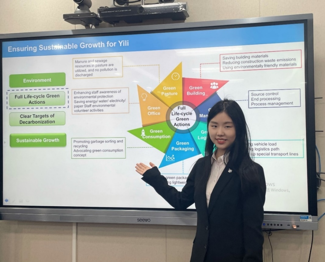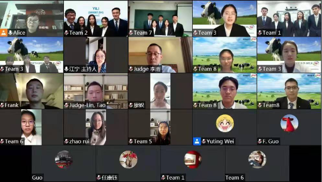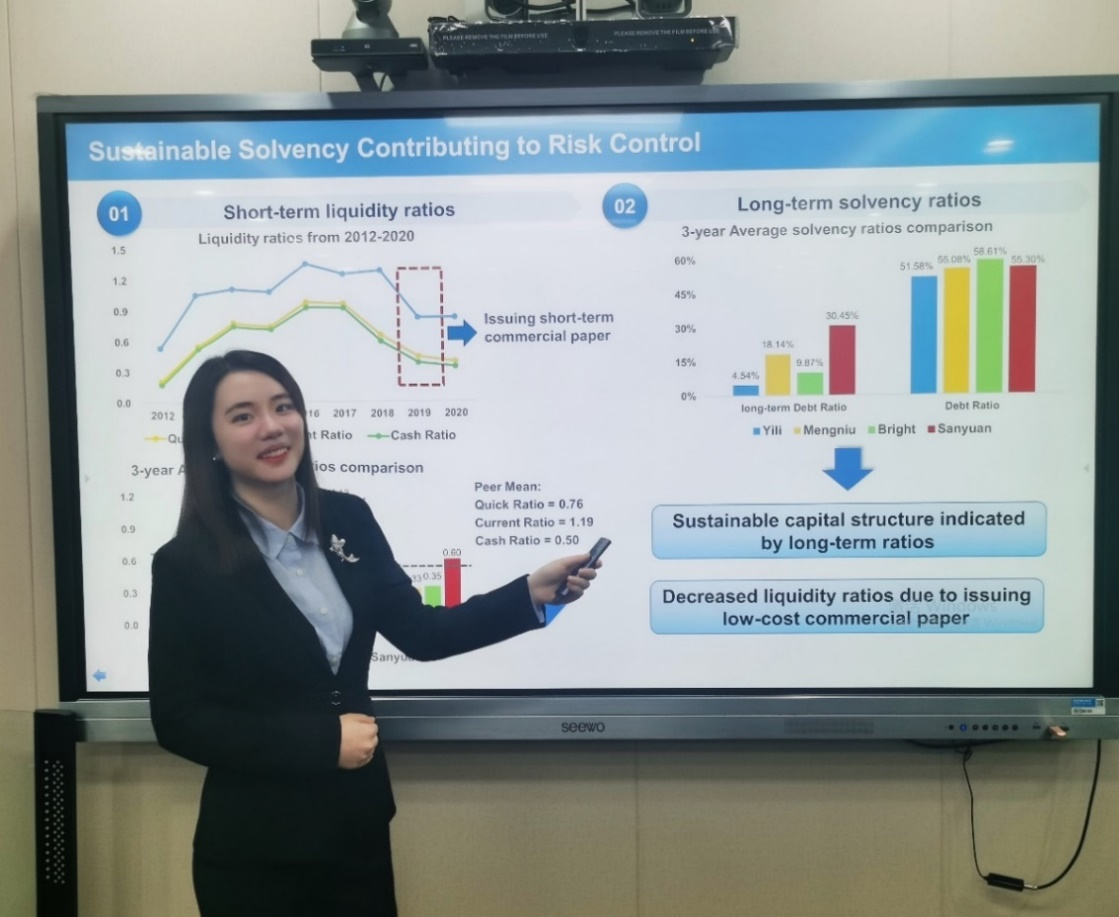 在线上路演环节,外交学院作为第一个登场的代表队,进行了英文路演,并对评委在ESG方面关于伊利在公司治理方面没有实际控制人、与竞争对手的高管团队有何差别,以及在行业、财务、估值方面的提问做了有理有据的回应,获得了参赛评委的高度评价。