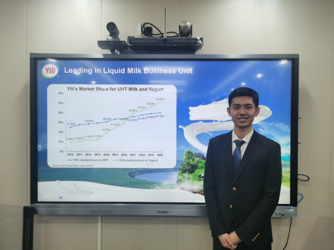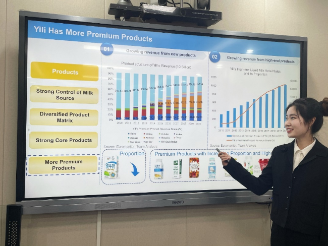 本次比赛的标的公司为伊利股份(600887.SH),为食品饮料行业的白马股,该公司具有很高的分析师覆盖率。如何解读分析海量的信息和观点、形成独特的研究视角,并得出有价值的结论成为本次研究的难点。同学们从全面的搜集信息开始,不仅详细阅读了公司网站、历年年报季报和投资者关系活动记录,还阅读了海量的行业研究报告及头部券商和研究机构出具的公司深度研究报告,以求深度了解行业各细分领域的商业逻辑及公司本身的盈利模式和财务特征。通过反复讨论,同学们确定了从产品、品牌和渠道三个维度去论证伊利的竞争优势,并从商业模式、财务、估值和ESG四方面去梳理对比伊利及其同行业竞争对手的定性和定量特征,形成了事实案例丰富、数据基础详实的最终研究报告,并设计制作了长达130页的精美PPT演示文稿。