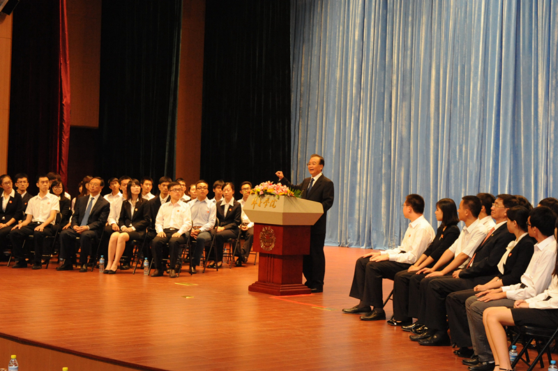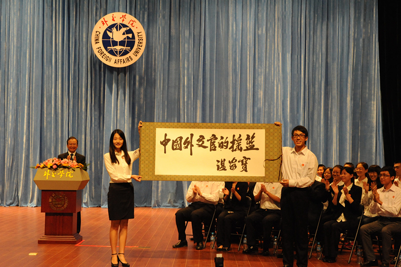 仪式后,温总理来到礼堂,在外长兼外交学院董事会主席杨洁篪的主持下,展示了温总理为学院亲笔题写的"中国外交官的摇篮"8个苍劲有力的大字。随后,温总理向在场的800余名师生及外交部新干班学员发表了重要讲话。阐述了中国外交的方针、政策和理念,列举了近年来中国外交所取得的巨大成就,强调在维护国家主权和领土完整问题上绝不退让的坚定立场。
