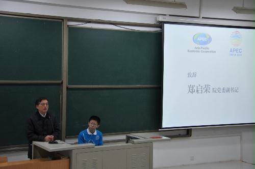 会议开始,郑启荣副书记致辞,他肯定了同学们的志愿热情,同时强调了参与此次APEC会议志愿活动的责任意识与重要意义。郑副书记讲到,志愿者是无私的、光荣的,需要敢于担当的勇气与吃苦耐劳的精神。他指出,APEC领导人会议是近期北京市所承办的最高规格的大型国际会议,机会难得,是对志愿者能力的考验。同时他强调,外交学院志愿者在会议服务中要牢记我校校训,时时刻刻牢记岗位职责,严守纪律,不可疏忽大意。最后,郑副书记对在座百余名志愿者提出了殷切期望,希望外院学子,为学院争光,为国家添彩。