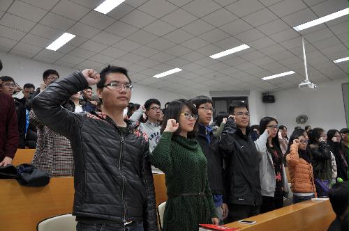 接着,在志愿者代表的带领下,百余名志愿者举起右拳,以饱满的热情宣誓:"站稳立场,掌握政策,熟悉业务,严守纪律",青春的声音刚劲有力,响彻会场。