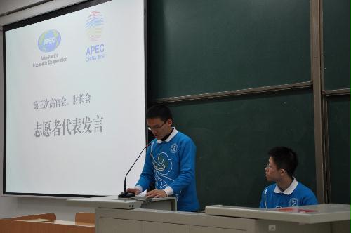 随后,两名参与过APEC第三次高官会、财长会的同学分别发言,分享各自的志愿服务经历及切身体验。
