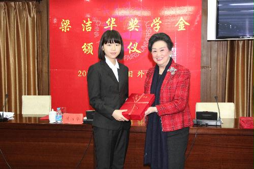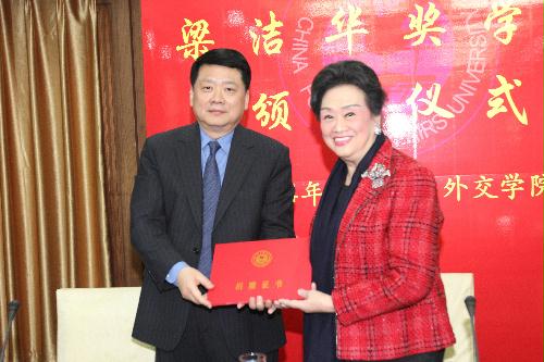 2014年11月13日下午,我院在展览路校区隆重举办首届"梁洁华奖学金"颁奖仪式。梁洁华艺术基金会主席、我院董事梁洁华博士、秦亚青院长、江瑞平副院长等学院领导及相关部门负责人和40余名获奖学生参加颁奖仪式,江瑞平副院长主持仪式。