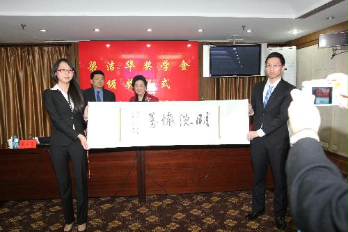 随后,江瑞平副院长宣读了"梁洁华奖学金"获奖学生名单,秦院长与梁博士共同为获奖学生代表颁发荣誉证书。