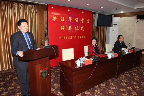 最后,秦院长发表讲话。他指出,梁洁华博士不仅关心、资助我院各项工作,还非常关心同学们的学业与成长,对我院发展做出了重大贡献。同时,他表示梁洁华奖学金的获奖学生都是精英中的精英,希望同学们继续保持良好的学习态度和端正的品行,为我国外交事业的发展多做贡献。