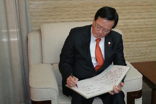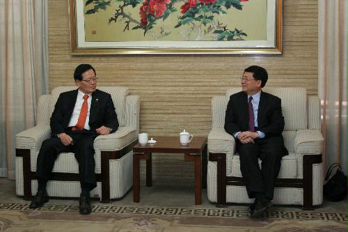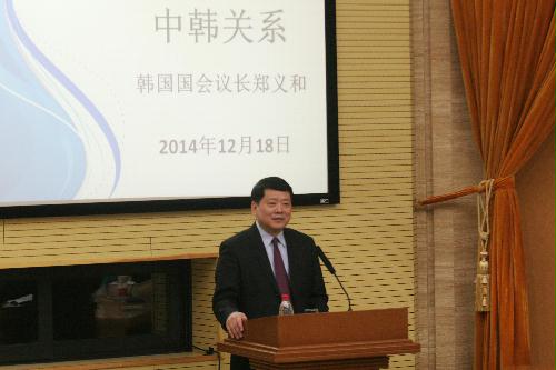 2014年12月18日上午,在全国人大常委会副秘书长曹卫洲的陪同下,韩国国会议长郑义和率团到访我院沙河新校区,并发表题为"中韩关系"的演讲。