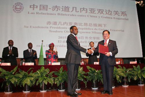 2015年4月28日上午,在中国外交部副部长张明、中国驻赤道几内亚大使赵宏声的陪同下,赤道几内亚共和国总统特奥多罗·奥比昂·恩圭马·姆巴索戈率团到访我院沙河新校区,并发表题为"中国-赤道几内亚双边关系"的演讲。