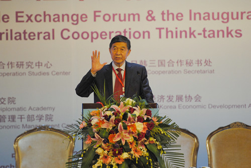 论坛闭幕式由外交学院副院长江瑞平教授主持,特邀外交部外交政策咨询委员会委员吴建民大使发表主旨演讲。吴大使就三国合作以及东亚区域合作等问题提出了自己独到的见解。