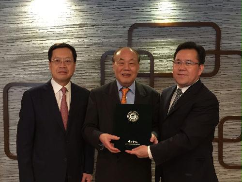 4月25日上午,江瑞平副院长与香港家全七福酒家有限公司董事总经理徐维均在香港会面,并向徐先生颁发第四届董事会董事聘书和外交学院荣誉教授聘书,嘉里建设有限公司主席兼首席执行官黄小抗出席。