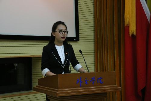 院团委书记王华迪同志代表共青团外交学院第十届委员会作了题为《引领青年先进思想服务学生成长成才——以共青团工作助力我校建成世界一流学科大学》的工作报告。报告指出,我院团委始终高举中国特色社会主义伟大旗帜,深入贯彻落实党的十八大以来重要会议精神以及习近平总书记系列重要讲话精神,认真学习贯彻中央党的群团工作会议精神,进一步加强和改进学校共青团工作。通过进行爱国爱校教育、开展团日团课、组织评优评奖、重组校媒格局等方式深化理想信念教育,引领青年先进思想;通过坚持党建带团建、加强队伍建设、提升团支部活力、完善规章制度不断加强自身建设,时刻做好党的助手和后备军;通过扶持品牌学生活动、营造优良学术氛围、积极开展志愿服务、深入引导社团建设、大力支持学生艺术团等建设多彩第二课堂,全面服务学生成长成才。