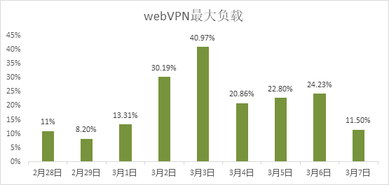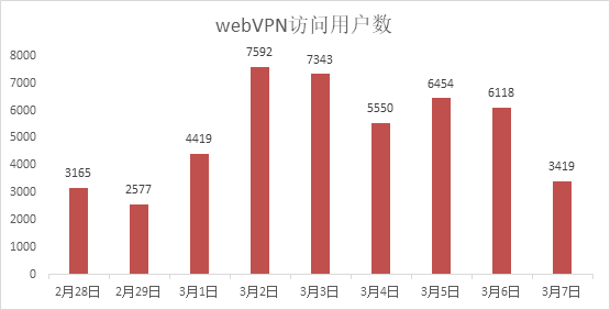 WebVPN是外交学院师生从校外访问校园网网络教学平台和校园网内网所有应用的入口,从图表可以看出,设备的高峰访问出现从3月2日开学第一天开始大幅度提高,设备的最大负载也随之提高。说明师生开学后大量利用网络教学平台开展教学。