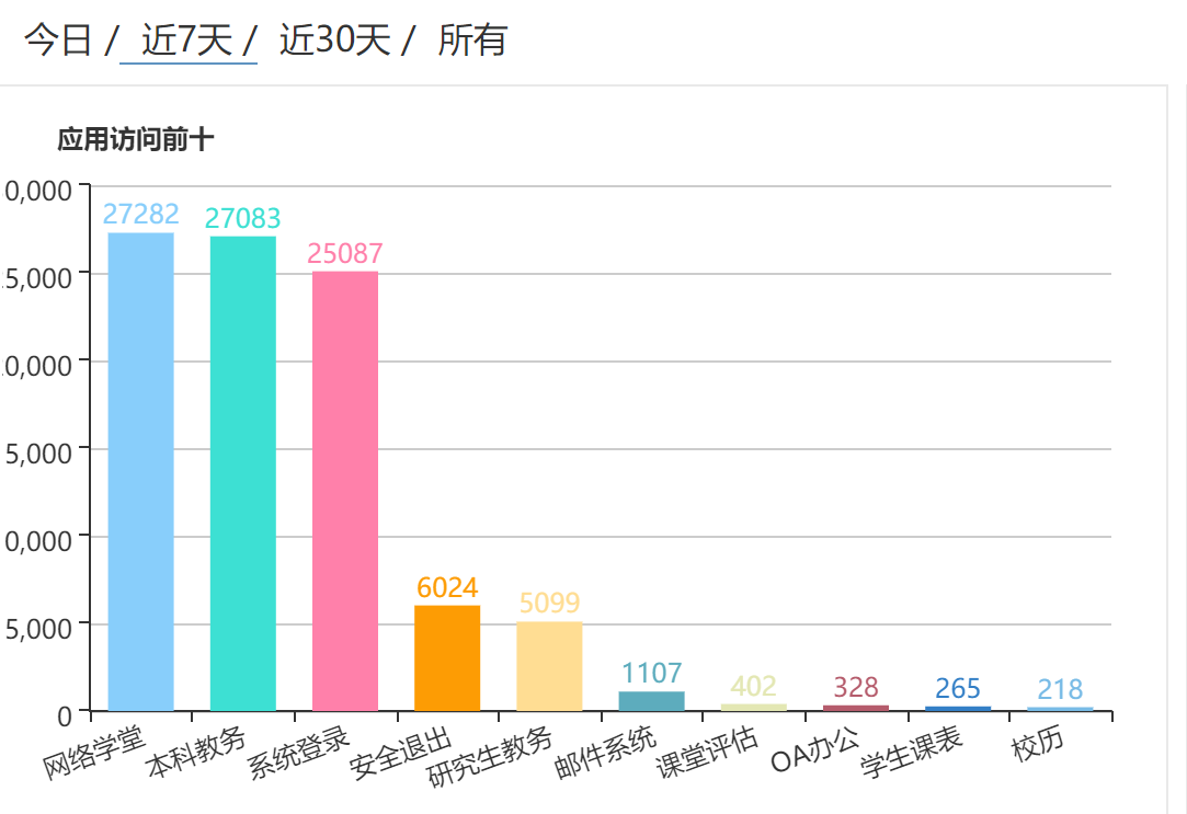 综合服务门户是校园网的统一身份认证和应用服务系统,该系统的日志统计分析结果是:近七天内网络学堂、本科教务、综合服务门户是访问量最高的应用。 网络学堂是访问量最高的应用,说明网络学堂对支撑学院的网络教学起到重要作用。本科教务访问量高原因是,教师在登成绩,本科生查询成绩和补退选课程。