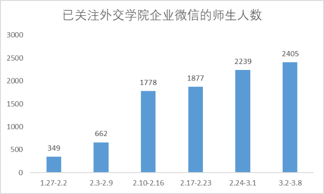 创建“外交学院网络学习学生群”,及时解决学生登录学校账号和选课数据问题。发布《外交学院企业微信教学直播操作指南》支持文档,学生顺利进入直播课堂。外交学院企业微信总共预置人员数据3133人,划分组织结构分组213个。上线关注人数从2月1日的349人,到3月9日大幅度提升到2405人。教职工使用率达94%,学生使用率达85%。