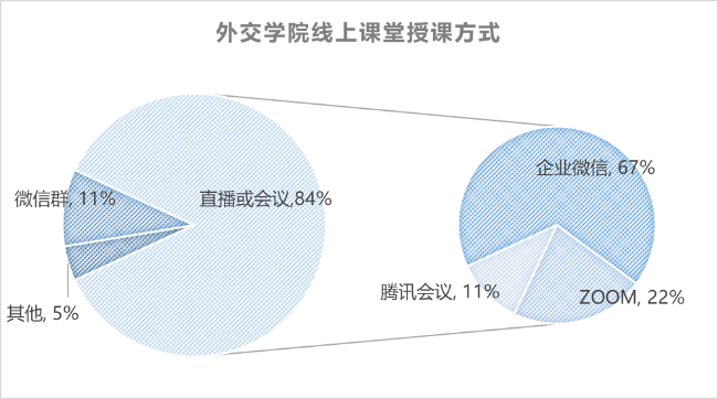 课堂授课方式依托多个技术平台,采用了多种网络教学方式,包括语音或视频直播、语音或视频会议、微信群互动、录播等。据统计,在线课堂授课84%采用直播或会议的方式,11%采用微信群和微课互动的方式,5%依托慕课等平台。其中直播或会议授课方式,67%使用企业微信的直播或会议系统,22%使用ZOOM会议系统,11%使用腾讯会议系统。