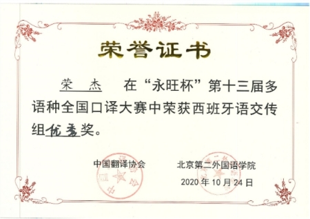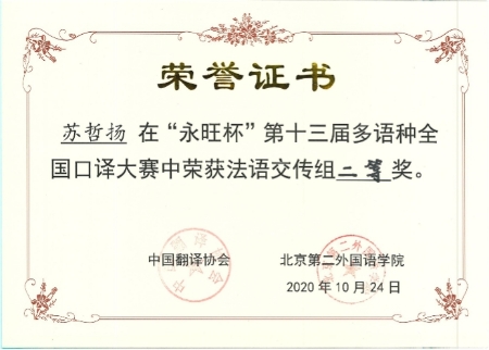 2020年10月24日,第十三届“永旺杯”多语种全国口译大赛落下帷幕。我院法语专业苏哲扬同学获得法语交传组组亚军(二等奖第一名),日语专业唐婧娆同学、郭艺林同学分别获得日语同传组和交传组优秀奖,西语专业荣杰同学获得西语交传组优秀奖。