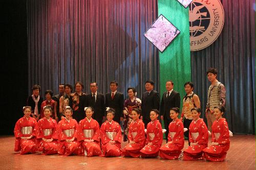秦院长介绍了我院与日本高校的合作交流情况,感谢友协把日本民音艺术团邀请到外交学院演出,并表示,相信此次演出会增进我院师生对日本文化的了解,外交学院作为外交部唯一直属高校,愿为促进中日民间交流、促进中日友好做出贡献。饭岛团长表示很高兴来外交学院演出,为学院即将迎来的60周年校庆锦上添花。双方互赠礼品后,共同前往礼堂观看演出。