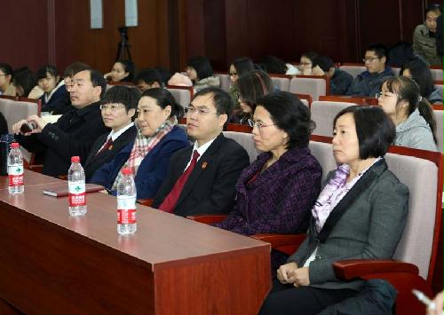 开通仪式由我院院长助理高飞教授主持,郑启荣副院长和蔡慧永院长分别发表了热情洋溢的致辞。郑启荣副院长在讲话中表示,建设涉外卓越法律人才教育培养基地需要理论与实践相结合,同学们只有了解实践中的审判,才能使法律思维与法律操作能力得到双提升。现阶段,我国各级司法机关办案量大,优秀法律人才仍很短缺,未来掌握在同学们自己手中。西城区法院与我院的合作必将促进同学们的系统法学学习,这种合作也必将加深双方的友谊。蔡慧永院长的讲话从贯彻十八届四中全会全面推进“依法治国”的战略部署的大处着眼,认为此次活动是双方深化合作的重要途径。法律院校与法院的关系就如同医学院与医院的关系,同学们只有全面了解司法实践,才能成长为优秀法学人才。蔡院长欢迎我院的同学们经常到西城区法院实践实习。
