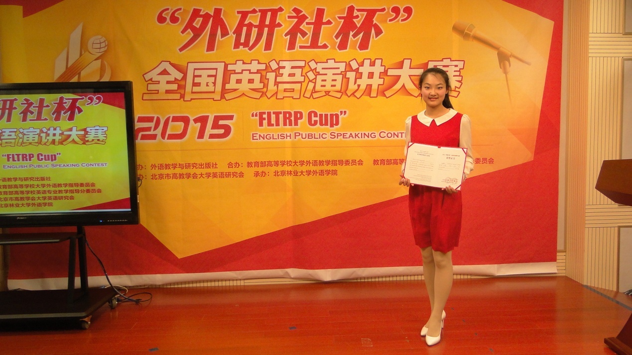 2015年“外研社杯”全国英语演讲大赛北京赛区复赛于11月1日在北京林业大学举行。本次大赛共有北京高校的54名优秀选手参加,经过残酷的淘汰赛和选拔赛后,我院英语系2015级学生张粲荣获一等奖。