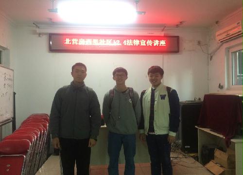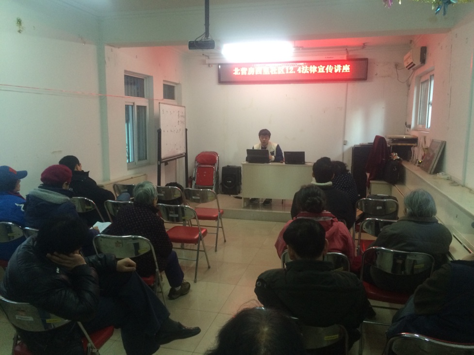 2015年12月4日国家宪法日,为了宣传法治理念,普及法律知识,外交学院法律援助中心和西城区北营房西里社区合作开展了法律宣传讲座活动,活动取得了完满成功。
