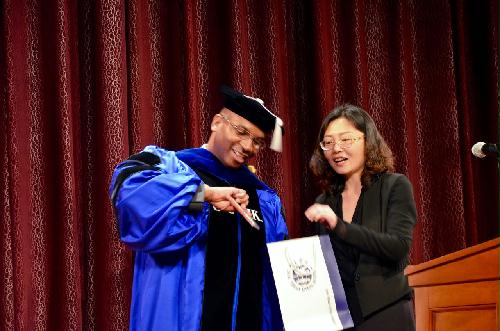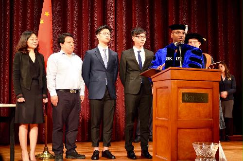 辩手们在罗林斯学院的礼堂参加了一年一度的“罗林斯杯”辩论邀请赛,中美两国辩手就中美关系的前景 (This house believes that conflicts between China and the US are inevitable.)进行了观点的交锋,呈现了一场精彩的辩论。在观众连连的欢呼声以及雷鸣般的掌声中,中方代表队获得了比赛的胜利。赛场上的针锋相对与场下的友好和睦相得益彰。赛后罗林斯学院辩论队教练Eric Smaw教授与我院杨悦副教授互赠了礼物,增进了罗林斯学院与外交学院的友谊。在场观众不乏重量级嘉宾,罗林斯学院董事会成员以及各专业的著名教授皆出席了此次活动。