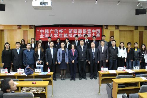2016年4月16日,“中视广信杯”第四届提案中国·全国大学生模拟政协提案大赛启动仪式于外交学院展览路校区隆重举行。本届大赛由外交学院、九三学社中央参政议政部共同主办,共青团外交学院委员会、外交学院知行学会承办。九三学社中央常委、北京市政协常委、北京市政协副秘书长、九三学社北京市委专职副主委方炎,北京市政协常委、共青团北京市委副书记黄克瀛,九三学社中央社会建设委员会委员、北京中视广信科技有限公司总经理徐建新等10余位九三学社、北京团市委等领导、老师应邀出席。外交学院党委副书记、纪委书记张瑱代表外交学院出席启动仪式。北京大学、北京外国语大学、北京理工大学、北京交通大学、中国青年政治学院、中国人民公安大学、对外经贸大学、国际关系学院、外交学院等高校的60余名选手代表参加。