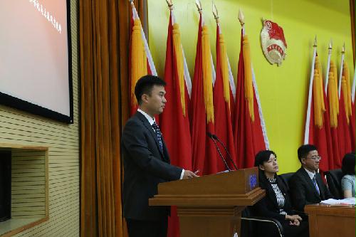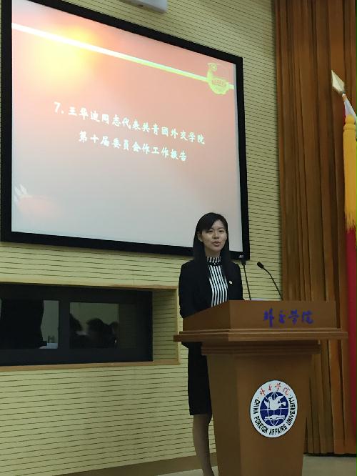 院团委书记王华迪同志代表共青团外交学院第十届委员会作了题为《引领青年先进思想服务学生成长成才——以共青团工作助力我校建成世界一流学科大学》的工作报告。报告指出,我院团委始终高举中国特色社会主义伟大旗帜,深入贯彻落实党的十八大以来重要会议精神以及习近平总书记系列重要讲话精神,认真学习贯彻中央党的群团工作会议精神,进一步加强和改进学校共青团工作。通过进行爱国爱校教育、开展团日团课、组织评优评奖、重组校媒格局等方式深化理想信念教育,引领青年先进思想;通过坚持党建带团建、加强队伍建设、提升团支部活力、完善规章制度不断加强自身建设,时刻做好党的助手和后备军;通过扶持品牌学生活动、营造优良学术氛围、积极开展志愿服务、深入引导社团建设、大力支持学生艺术团等建设多彩第二课堂,全面服务学生成长成才。