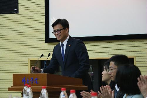 北京团市委副书记杨海滨用七个小故事生动阐释了对我院十六字校训的理解,并现场将俄罗斯联邦驻华大使杰尼索夫写给APEC志愿者的感谢函原件赠送给我院团委,以表彰我院青年在APEC志愿活动中所作出的突出贡献。外交部团委书记汪亮书记肯定了外交学院团委在外交部共青团工作中所作出突出贡献并对我院外交青年们提出了切实要求。国际关系学院团委书记吴启春作为兄弟院校代表致辞,描述了两校之间兄弟般的情谊,表达了希望两校携手共同发展的希冀。