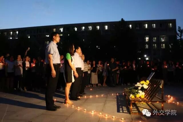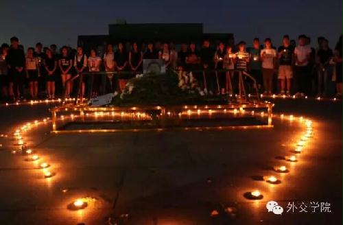 夜幕笼罩下的伟人广场庄严肃穆,哀乐低回。吴院长的遗像被安放在鲜花翠柏丛中,参加追思活动的外交学院学生手持蜡烛侍立两侧,默哀追思。