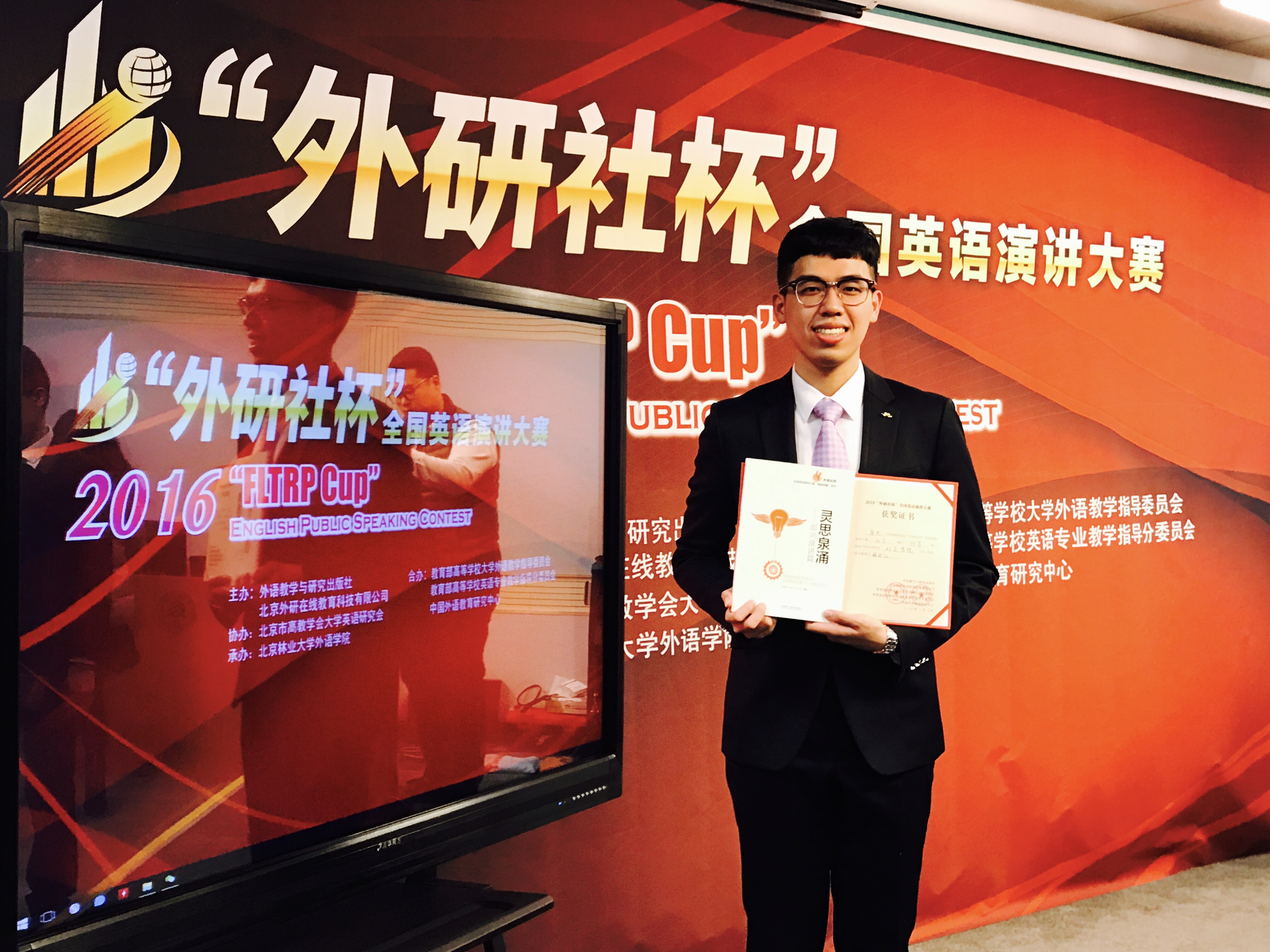 2016年11月5日,2016年“外研社杯”全国英语演讲大赛北京赛区复赛在北京林业大学拉开帷幕。英语系本科二年级学生唐杰代表我院参加了比赛,与来自北京几十所高校的55名优秀选手同台竞技,取得了特等奖的优异成绩,从高手林立的北京赛区突围,成功晋级全国总决赛。