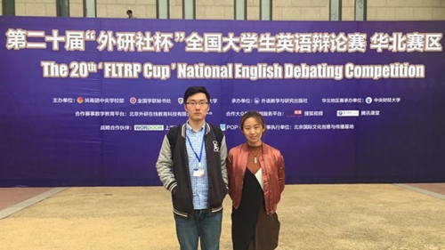 2017年第二十届“外研社杯”全国大学生英语辩论赛华北赛区决赛于2017年4月4日下午在中央财经大学结束,共有100支参赛队伍参加了比赛。英语系王俊良、胡韵哲同学经过五轮循环赛的激烈角逐,获得一等奖。外交学院代表队成功晋级全国总决赛,同时,我院也被授予“优秀组织奖”。