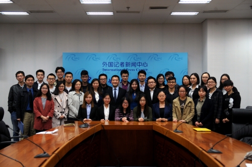 2017年4月19日下午,英语系本科翻译专业2014213班,2014214班的同学们在英语系主任石毅与杨悦老师的带领下走进外交部新闻司,与外交学院英语系校友、外交部新闻司陆慷司长进行座谈,观摩外交部例行记者会,上了一堂生动的《外交口译》观摩实践课。