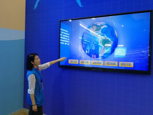 志愿者为参观者展示展厅互动装置