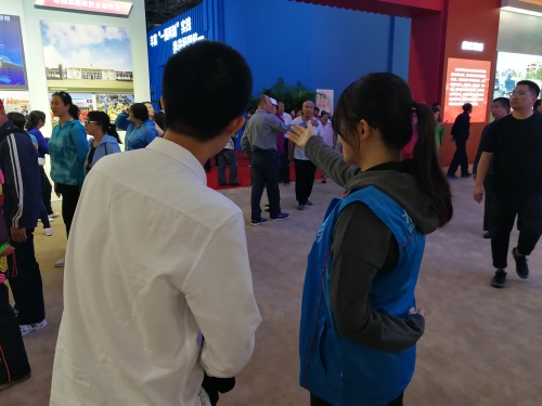 9月26日是成就展面向公众开放的第一天,我院30名志愿者参加了首日的服务活动。志愿者分布在门票入口、序厅和各个展区,服务内容包括展区现场引导、翻译讲解、发放宣传册及信息咨询等四项工作。