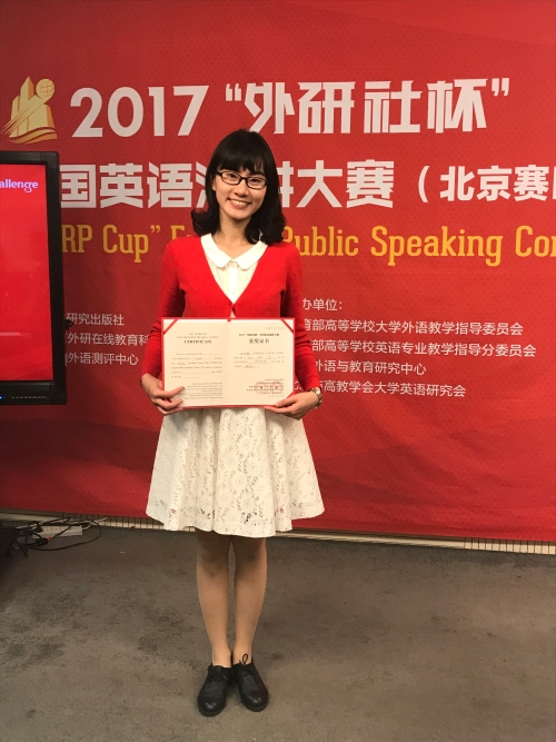 2017-11-032017年10月28日,2017年“外研社杯”全国英语演讲大赛北京赛区复赛在北京林业大学举行。英语系本科二年级学生沈佳楠代表我院参加了比赛,与来自北京几十所高校的48名优秀选手同台竞技,取得了二等奖的好成绩。比赛由淘汰赛和选拔赛两个阶段构成,第一阶段是3分钟的即兴演讲,排名最高的前15名同学晋级第二阶段;第二阶段包括3分钟定题演讲、3分钟即兴演讲和两个问题的回答。在上午激烈的淘汰赛阶段,沈佳楠同学发挥出色,以第七名的成绩顺利晋级下午的选拔赛。在选拔赛中,沈佳楠同学不畏强手,以稳定的表现获得二等奖。“外研社杯”全国英语演讲大赛由外语教学与研究出版社和教育部高等学校大学外语教学指导委员会合办,该项赛事于2002年创办,已成为全国参赛人数最多、规模最大、水平最高的英语演讲赛事之一。沈佳楠同学在强手如林、竞争激烈的北京赛区获得了好成绩。在此祝贺沈佳楠同学!感谢英语系创新实践训练中心演讲团队指导老师的赛前辅导和培训!同时感谢学院相关部门的大力支持!