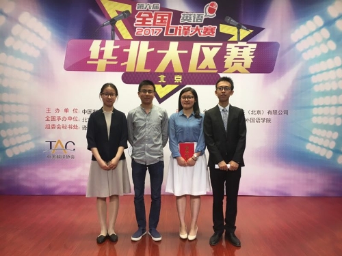 2017-05-232017年5月13日,第六届全国口译大赛(英语)华北大区赛在首都经济贸易大学外国语学院举行。本次大赛由中国翻译协会主办,北京中译天凯教育咨询有限公司承办,来自北京、河北、天津、山西四个赛区的74名选手参加了比赛。经过激烈角逐,英语系研究生杭素获二等奖,王诗涵、王亦秋获三等奖。杭素同学晋级全国总决赛。全国口译大赛是一项面向全国高校具备一定英语口译能力和专业训练的在校学生举办的传统赛事,迄今已成功举办五届。大赛共分学校初赛、赛区复赛、大区赛和全国总决赛。今年的比赛覆盖全国六个大区,共有546名选手参与了大区赛的角逐。我院英语系同学在比赛中以饱满的精神、娴熟的口译技能、灵活的应变能力赢得了评委和观众的好评,充分展现了我院学生的口译水平,为外交学院赢得了荣誉,特此向他们表示热烈祝贺,并预祝杭素同学在接下来的全国总决赛中取得好成绩!感谢英语创新实践训练中心口译指导团队的教师们为他们提供的赛前辅导和培训!同时感谢学院相关领导和部门的大力支持! 英语系 2017年5月17日