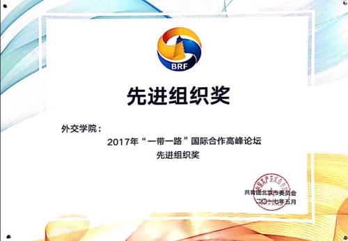 6月15日,2017年“一带一路”国际合作高峰论坛志愿服务交流分享会在北京召开,大会表彰了在2017年“一带一路”国际合作高峰论坛期间的先进组织。我校荣获共青团北京市委员会颁发的“2017年‘一带一路’国际合作高峰论坛先进组织奖”。我校“一带一路”国际合作高峰论坛志愿服务新闻发布组、媒体服务组、新闻综合管理组获“模范团队”称号,我院外交学与外事管理系大三学生方博、白洋2名同学获“优秀志愿者”称号。院团委2017年7月2日
