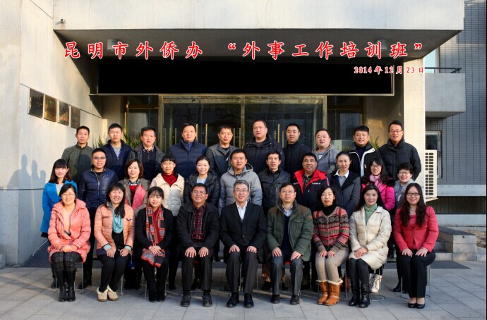 2014-12-30应昆明市外侨办委托,国际交流中心于2014年12月22日至27日成功举办了昆明市外侨办2014年"外事工作培训班",学员共28人,昆明市对外友好协会专职副主任汪浩为带队领导。 该培训班是交流中心首次与昆明市外侨办合作项目,在学院各级领导的大力支持、任课教师的共同努力和各部门的通力合作下,获得了主办方和学员们的一致好评。 培训班共安排了7次讲座,授课教师分别来自外交学院、外交部、全国政协外委会等单位。讲座主题涉及当前国际形势与中国外交的各方面,尤其注重联系昆明实际,在与东南亚国家关系、一带一路建设等方面打造课程。除了课堂学习之外,学员还前往钓鱼台国宾馆和国家博物馆参观学习。 院领导对培训班工作非常重视,徐赤宇副院长出席了开班和结业仪式,代表学院致辞,并在结业仪式上为学员颁发结业证书。 课程结束后,学员于12月27日统一离京,本次培训圆满结束。此次培训是我院与昆明市外侨办合作的首次外事工作专题培训,得到了双方领导的高度重视,在双方的共同努力下,取得了圆满成功,同时也为双方在今后的合作培训、交流互访、学科调研等方面创造 了良好的条件。