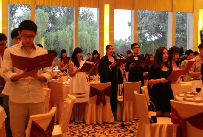 铿锵有力的《走向复兴》主旋律为晚会拉开了序幕。107名2014届IPP毕业生的大合唱承载着中华民族走向辉煌的伟大复兴梦,伴随着同学们发自心胸的高亢激昂,充满激情的歌声响彻在钓鱼台金色大厅,震撼着在场的每一位嘉宾。雄壮的歌声充分体现了IPP同学们奋发向上的饱满斗志和积极进取的精神风彩,也向大家展示了同学们为实现中华民族伟大复兴的坚定信心和决心。这浓墨重彩的一笔把毕业典礼推向了高潮。接下来,同学们则以出众的才华,特殊的技艺向大家展示了一台异彩纷呈,新颖独创的汇演节目。得到了各位领导、嘉宾及全体师生的一致好评和阵阵喝彩。