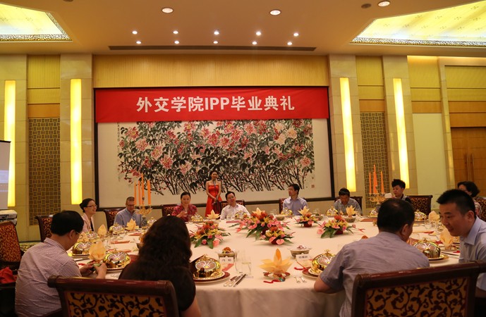 在即将迈入世界一流名校之际,满怀着对未来的美好憧憬,外交学院国际教育合作项目(IPP)2014届全体毕业生,在庄严肃穆、浑然天成的钓鱼台国宾馆庄重的唱响了中华民族伟大复兴的主旋律。铿锵有力的《走向复兴》主旋律为晚会拉开了序幕。百余名2014届IPP毕业生的大合唱承载着中华民族走向辉煌的伟大复兴梦,伴随着同学们发自心胸的高亢激昂,充满激情的歌声响彻在钓鱼台金色大厅,震撼着在场的每一位嘉宾。这浓墨重彩的一笔把外交学院IPP2014届毕业典礼推向了高潮。