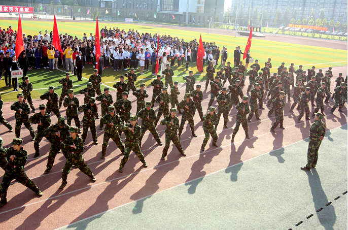 最是金秋硕果累,但数风流看今朝。在运动会开幕式各支展演队伍中,若说让人眼前一亮的,非中加班学子们的展演方阵莫属了,若说展演过程中赢得掌声最多的,莫过于中加班军体拳方阵表演了。看,学子们身着军训服装,在英姿飒爽的引导员和威风八面的护旗手的带领下,喊着嘹亮的"外交学子,教院精英,中加合作,共创未来"的口号,迈着整齐划一的正步来到主席台前,随着一声令下,井然有序的散开,进行了一场如同汇报演出般的军体拳表演。伴随着学子们高亢激昂、威武雄壮、舍我其谁的表演,主席台、看台和操场上的领导、老师和同学们都不约而同的、不由自主的给予一波又一波的热烈的掌声、惊叹声和喝彩声。整个展演一气呵成,精彩之极,充分展示了中加班学子们过硬的作风和真我的风采。