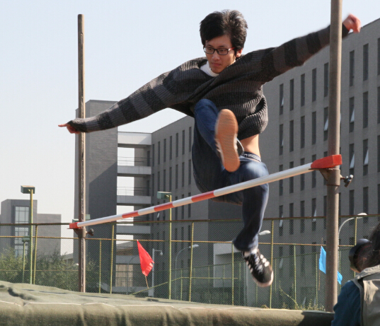 来自浙江的陈悦同学参加的女子跳高比赛更是高手如云,一次次的升杆,一次次的淘汰,留下的人越来越少,竞争却越来越激烈,真是让人心潮澎湃的比赛啊。陈悦真是好样的,但看最后一跳,她轻盈的身躯跃过1.25米的横杆,新的女子跳高校运会纪录诞生了。