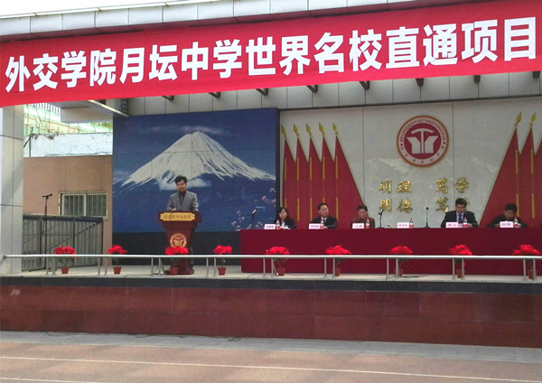 随后,外交学院院长助理、教务处处长高飞教授代表外交学院致辞。他说,外交学院是外交部唯一直属的全国重点高校,建校六十年来培养出400多位共和国驻外大使,是名副其实的 "中国外交官的摇篮"。一直以来,学院十分注重发展国际教育,于2006年创立了外交学院国际教育合作项目(IPP),该项目是外交学院最成熟,最有品牌效应的国际教育合作项目,是在新的时代背景下开设的新窗口。今后,外交学院将发挥雄厚的外交和教育资源优势,与月坛中学密切协作,承担起并肩前行的使命,共同开创国际化人才培养新模式,从而为更多优秀学生进入世界一流名校提供有力保障。