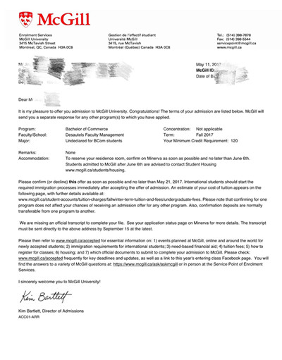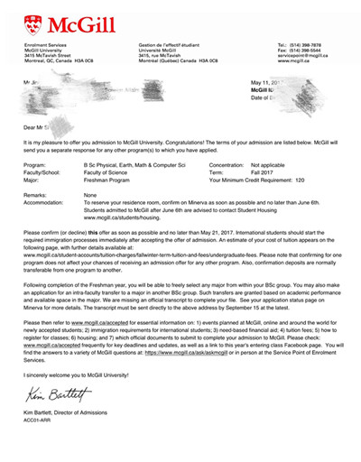 外交学院国际教育合作项目(IPP)2016级的上官竞帆同学在成功被加拿大英属哥伦比亚大学(UBC)录取后,于昨日同时收到加拿大麦吉尔大学商学院和理学院的录取信。